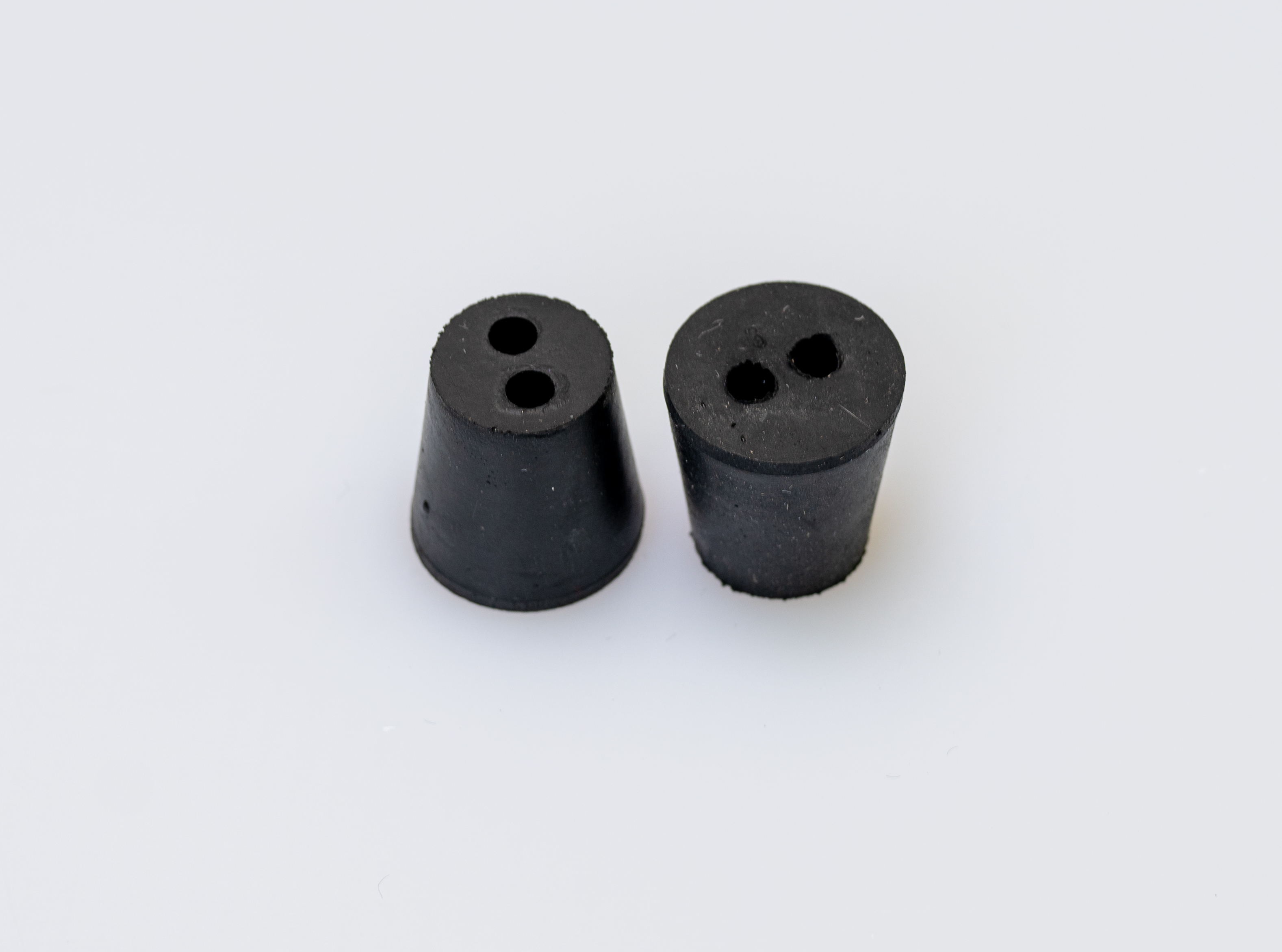Our stock standard grade stoppers are manufactured from a premium grade SBR black rubber compound with a 1.342 specific gravity (they do not float in water). They have a temperature usage range of -40C to 70C. The 40 (+/-5) Durometer material is soft, pliable and long lasting. Solid, one-hole, and two-hole in sizes from #000 to #15 are available. Contact us for pricing on large volumes of custom compounds or colors.